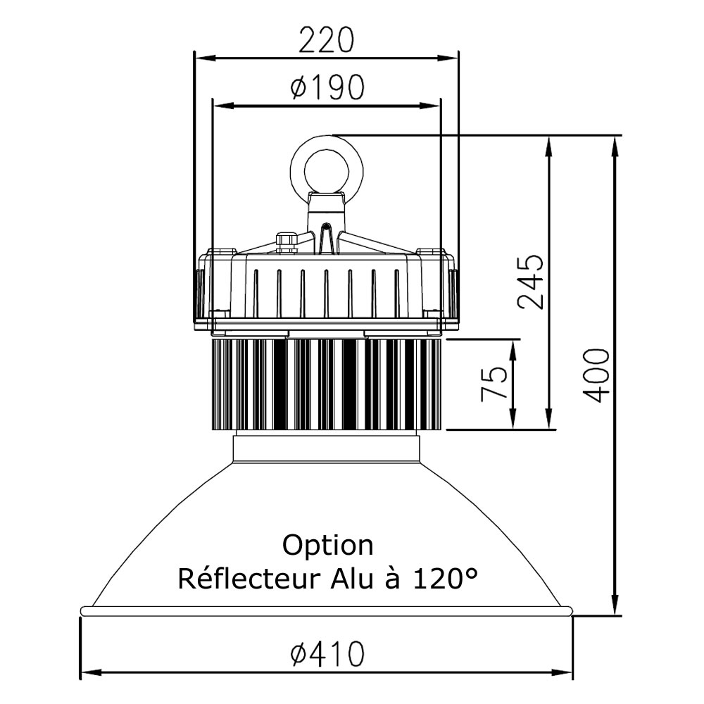 | AHL= Armature à Led Quartz Eco | 050= 50W | _= Alu | O30= OSRAM Duris S5 3030 | 40= IP40 | 7= >70 | 27= 2700°K | _= No Dim |